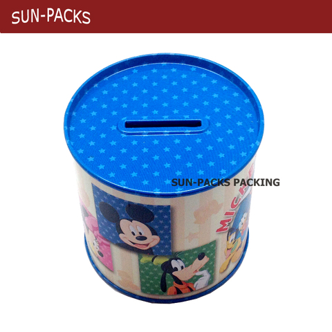 Banco de monedas de hojalata redondo con cerradura para ahorrar dinero